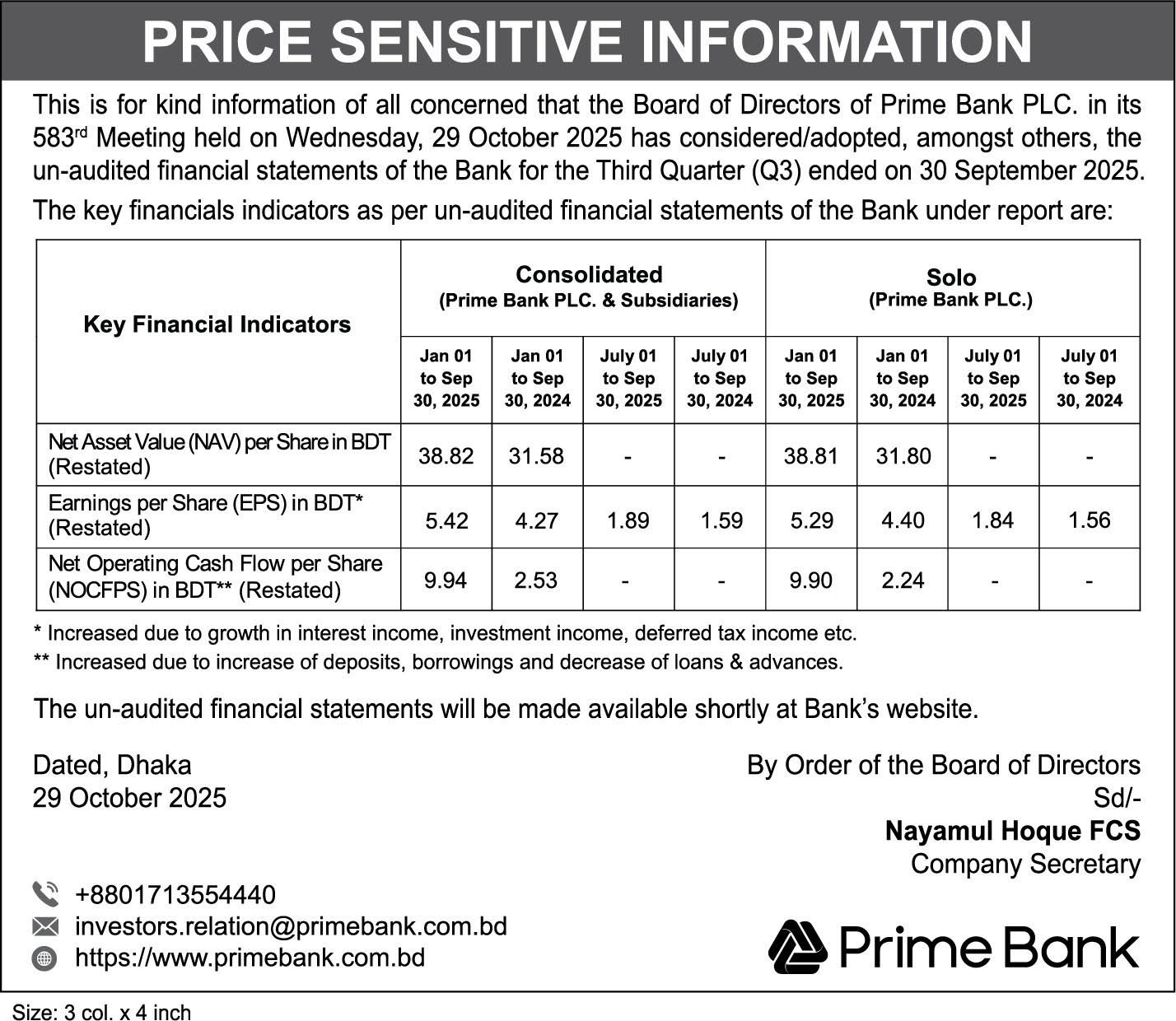 Price Sensitive Information on unaudited Financial Statements for the Third Quarter, 2025 |